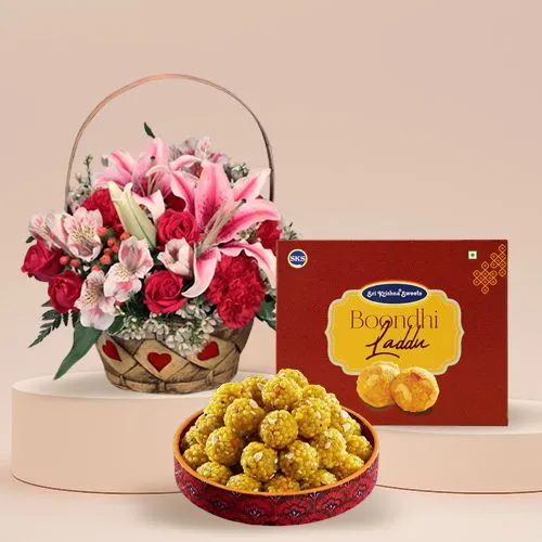 Brighten someone’s day with this vibrant floral arrangement, featuring a mix of pink Asiatic lilies, red carnations, and pink roses, totaling 20 blooms in a burst of color and fragrance. This stunning floral display is paired with 250g of Boondi Laddu, a beloved traditional Indian sweet. The sweetness of the laddu complements the elegance of the flowers, making this gift ideal for festive occasions, celebrations, or simply expressing your gratitude and joy. The blend of vibrant colors and delicious sweetness creates a heartwarming and visually striking gift.