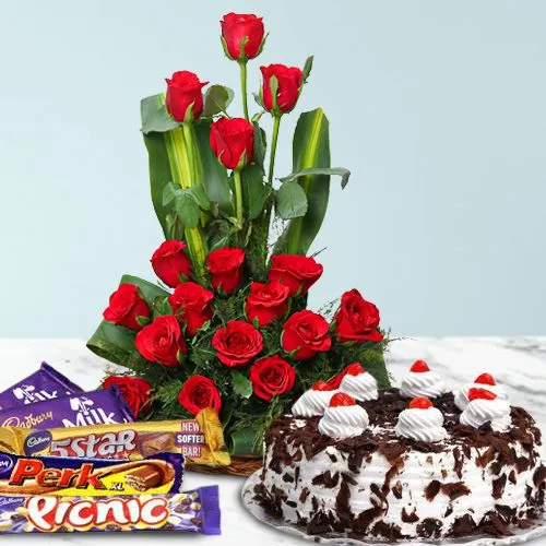 18 Dutch Red Roses Bouquet with 1 Lbs. Black Forest Cake and 1 Cadbury's Celebration Pack (Weight : 126 gms)