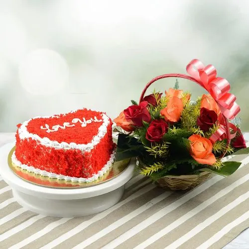 Order this Alluring Mixed Roses Basket n Red Velvet Heart Shape Cake to make your dear ones happy. This Flowers N Cake gift combo is composed of: