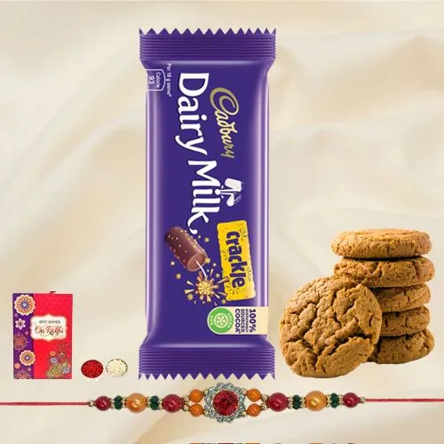 Surprise your brother with Assorted Cookies and Cadburys Chocolate with Rakhi. This hamper has a Cadburys Dairy Milk Crackle Chocolate Bar with 100 gms Assorted Cookies and 1 Attractive Rakhi. Free Roli Tika n Chawal included.