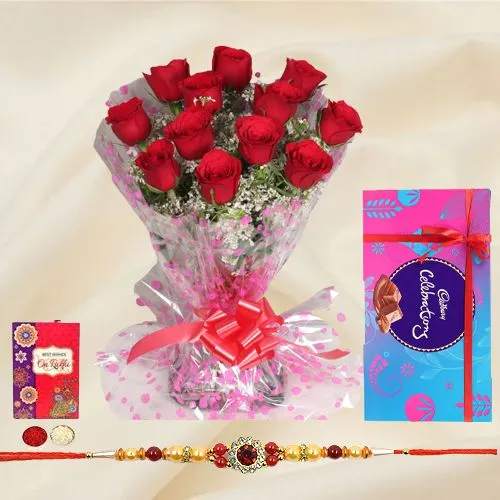 Make this Raksha Bandhan memorable with a classic gift combo designed to bring joy and warmth to your celebrations. Featuring a vibrant Rakhi that reflects your unbreakable bond, a Cadbury Celebration Pack (117 gms) bursting with delightful treats, and a bouquet of 12 radiant red roses, this combo captures the essence of love, sweetness, and heartfelt emotions. It’s the perfect way to show your sibling how much they mean to you, creating cherished memories that last a lifetime. Send your love wrapped in elegance and flavor with this all-in-one festive surprise.