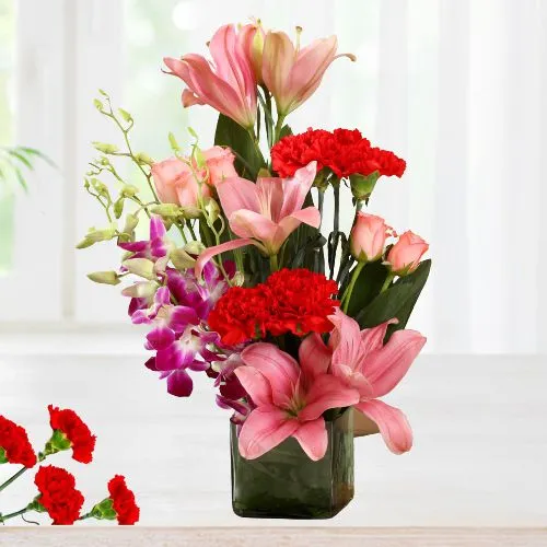 Let someone know that you have feelings for him/her by sending this Designer 21 Flowers for Love in a glass vase. This arrangement is made with 7 Red Roses, 7 Red Carnations, 4 Purple Orchids N 3 Pink Lilies in a Square Glass Vase and sweep them off their feet on Valentines Day.