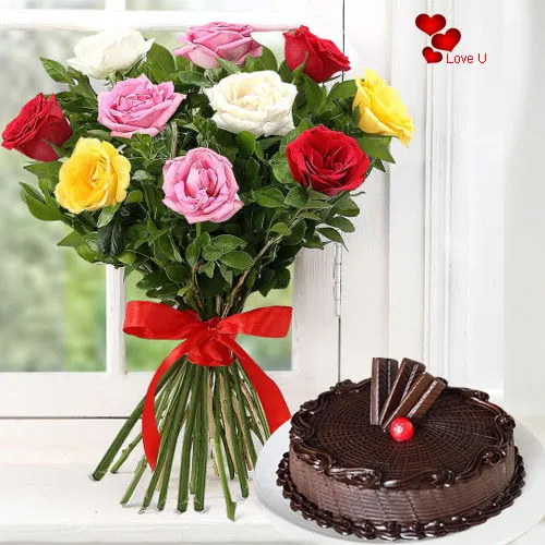 A Dozen Assorted Colour Rose with Fresh Baked 1/2 Kg. Chocolate Cake