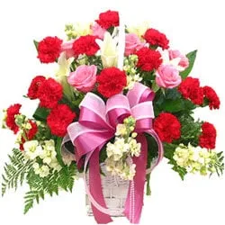 Amaze your loved ones by gifting them these Exotic 10 Red Carnations N 7 Pink Roses along with Delicate Filler in a Basket and make them crave for more.