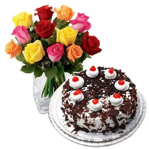 24 Mixed Roses with 2 Kg Black Forest Cake from 5 Star Bakery