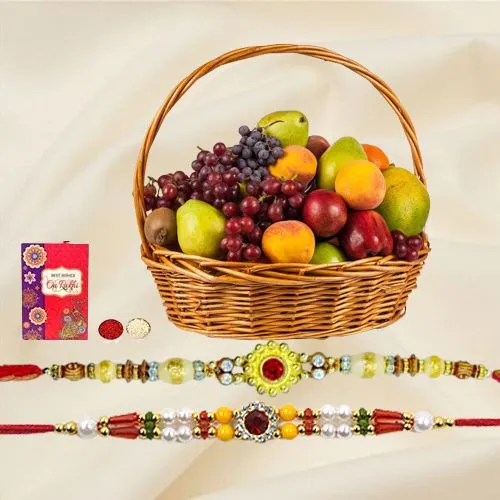 Make this Raksha Bandhan memorable with a gift that speaks volumes of your affection. This delightful hamper includes a 2 Kg assortment of handpicked fresh fruits such as apples, oranges, grapes, and more—an ideal blend of taste and nutrition. Alongside, youll receive two complimentary Rakhis designed to charm, and a set of Roli Tilak and Chawal to complete the traditional ritual. Whether youre sending love from afar or celebrating together, this gift pack brings a perfect balance of health, festivity, and sibling warmth.
