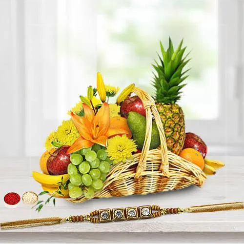 Fresh Fruit Hamper (5 Kg.) consisting of different types of High Quality Fresh Fruits like Apples, Bananas, Oranges, etc with 1 Family Set Rakhi and Roli Tilak Chawal.