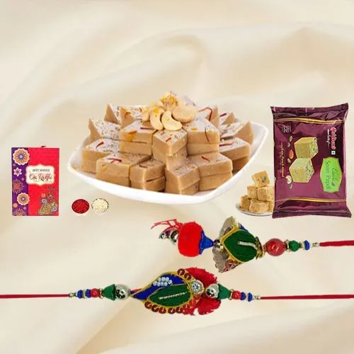 Mark the festival of Raksha Bandhan with this elegant gift set curated specially for your Bhaiya and Bhabhi. At its heart is a Premium Rakhi Set—graceful, festive, and full of love. Paired with sweet indulgence, the hamper includes Haldiram’s Kaju Katli (200 gm) and Soan Papdi (200 gm), two timeless Indian treats that never fail to delight. A complimentary message card helps you pen your love, while Roli, Tika, and Chawal complete the traditional rituals. Gift a blend of tradition and sweetness they’ll cherish.