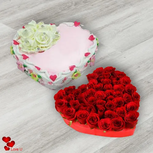 50 Heart Shape Dutch Red Roses with 1 kg Heart Shape Cake