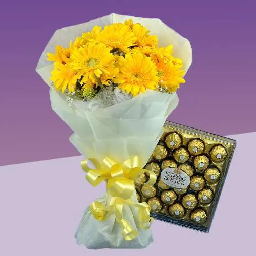 Gift online this gift of Lovely Yellow Gerberas Bouquet with Ferrero Rocher and create an extremely joyful moment for your dear ones.