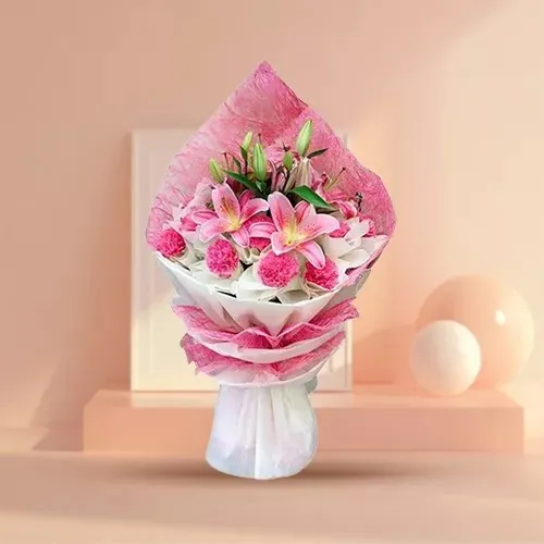 This Gift Pack has Flower Bouquet of Pink Lilies and Carnations as Retirement Gifts for Dad.