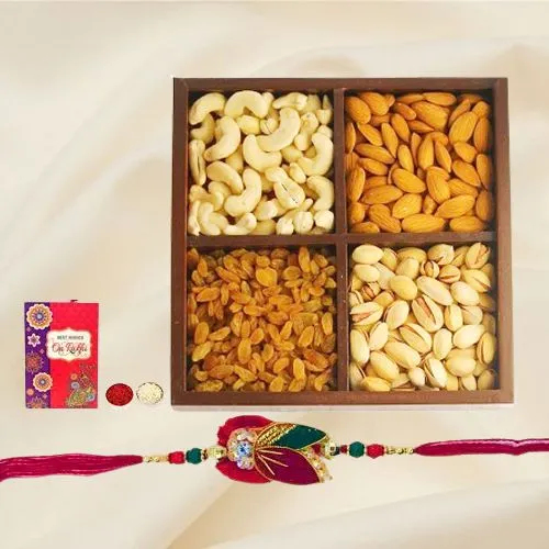 Surprise your sibling with a thoughtful and traditional Raksha Bandhan gift that combines health and festivity. This specially curated set includes 500 grams (gross weight) of assorted dry fruits—almonds, cashews, pistachios, and raisins—each packed with nutrients and flavor. A beautifully designed rakhi comes free with this set, along with Roli Tilak Chawal, ensuring you have everything you need for the rituals. This elegant gift is perfect for conveying love, respect, and good wishes on this special occasion.