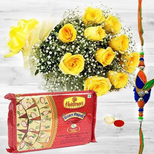 Bring a smile to your siblings face with this delightful Raksha Bandhan gift combo featuring a stunning bunch of 12 yellow roses that convey joy and affection. Paired with 200 grams of classic Indian sweet Soan Papdi, the set adds a sweet flavor to your celebration. The inclusion of an elegant Rakhi completes the traditional gesture, making this package a heartfelt expression of love and protection. Whether youre near or far, this combo is the perfect way to make your presence felt and cherish your sibling bond.
