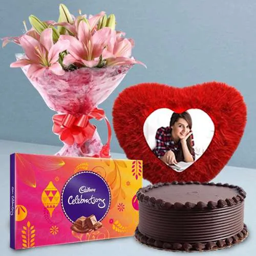 This Gift Combo include a Personalized Cushion with a digital photo, an elegant 6 Lilies Bouquet, a Cadbury Celebration Chocolate Pack (126g) and a 1lb Chocolate Cake.