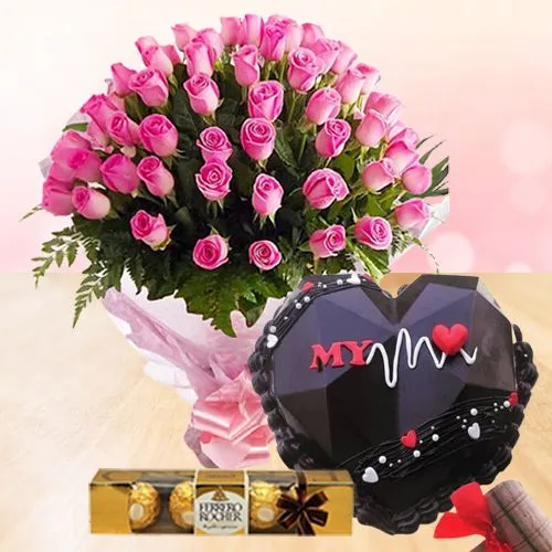 Mesmerize your loved ones with this gift of Spellbinding 36 Pink Roses Tissue Wrapped Bouquet, Heart Shape Chocolate Pinata Cake (500g) with Hammer n 4pcs Ferrero Rocher Chocolate Pack and make their Valentines Day very special.