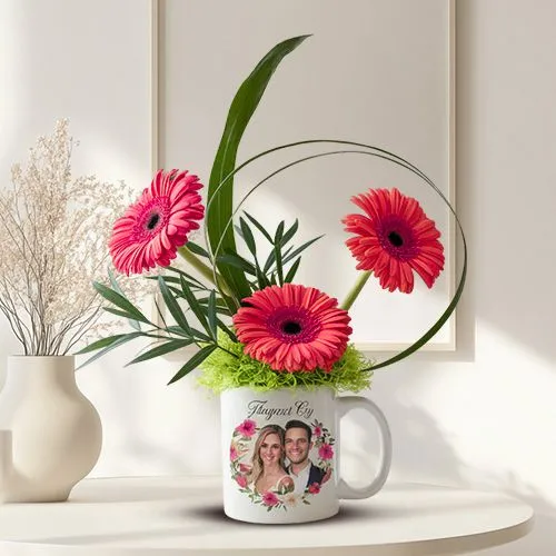Fascinate your dear ones on Valentines Day with this Splendid Gift of Personalized Coffee Mug Full of 3 Red Gerbera to incorporate in their hearts, the eternal beauty of the feeling called love.