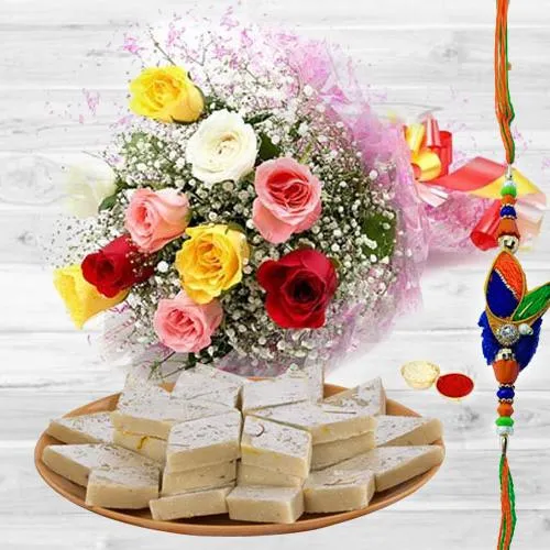 Mark the sacred festival of Raksha Bandhan with a delightful gift set that combines beauty, sweetness, and tradition in one charming package. This thoughtfully curated combo includes a vibrant bouquet of 12 mixed roses, artfully wrapped in net tissue to symbolize your heartfelt emotions. Alongside, indulge your sibling with 250g of premium Kaju Katli, offering a rich, melt-in-the-mouth experience that adds sweetness to the occasion. A beautifully crafted Rakhi is included to adorn your brothers wrist, symbolizing your bond of protection and love. The set is completed with Roli Tika and Chawal to ensure all traditional rituals are beautifully observed, making this an all-in-one celebration package.