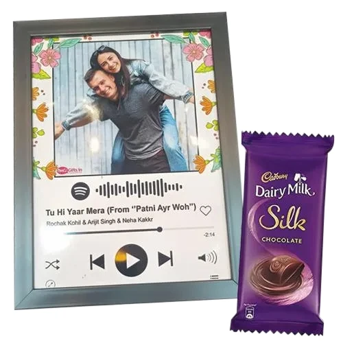 A blend of creativity and indulgence, this gift set includes a Cadbury Dairy Milk Silk (60g) bar with its signature smooth texture and rich chocolate flavor, perfect for satisfying any sweet craving. Alongside it is a Personalized Music Photo Frame—an innovative piece that lets you turn a cherished photograph into an audio-visual experience by linking it with a favorite song. Its a great way to relive moments with a bite of chocolate and the sound of a memory.