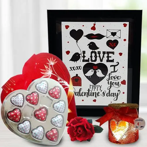Add glow and happiness on his/her face on Valentines Day by sending this Appealing Gift of 1 Handcrafted Love Message Frame with Led Lamp n 11 pc Heart Chocolate and brighten the day of love.