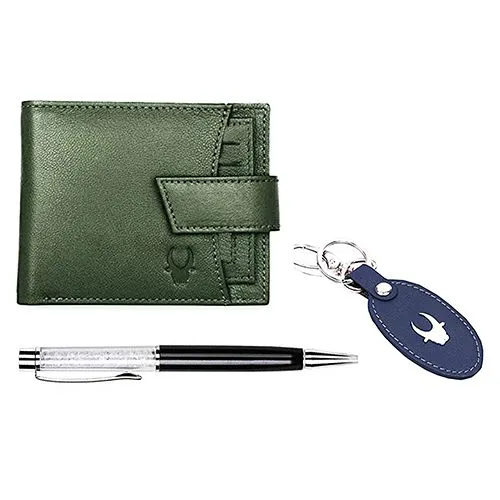 Celebration special wishes are best delivered by gifting this Astonishing Pair of WildHorn Leather Mens Wallet with Keychain N Pen to your family and friends.