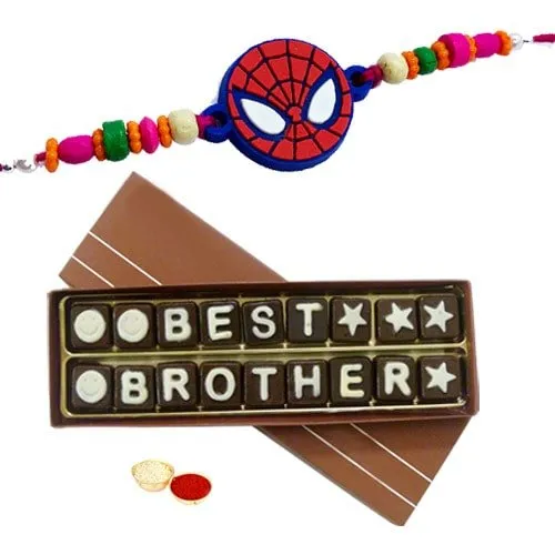 Best Brother Chocolate Pack (18 Pcs) with 1 Spiderman Rakhi and Roli Tilak Chawal.