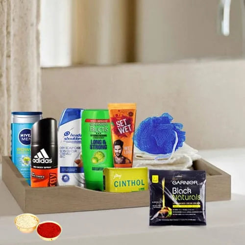 Deliver happiness by sending this Bright Little Luxury Pamper Hamper to make others happy. This Hamper is enclosed with Addidas Deodorant Body Spray - Men Energy (120 ml Bottle), Set Wet Style Hair Gel - Wet Look (50 ml Tube), Garnier Black Naturals - Shade 1 (20 ml + 20 gm), Garnier Fructis Conditioner - Long N Strong Fortifying (80 gm), Head N Shoulder Shampoo - Long N Strong Fortifying (175 ml), Nivea Shower Gel - Power Refresh for Men (250 ml), Nivea Face Wash - Dark Spot Reduction 10X Whitening (50 ml Tube), Cinthol Bathing Soap - Lime Fresh (100 gm), Nivea Loofah, Towel in a Tray with free Roli Tilak and Chawal.