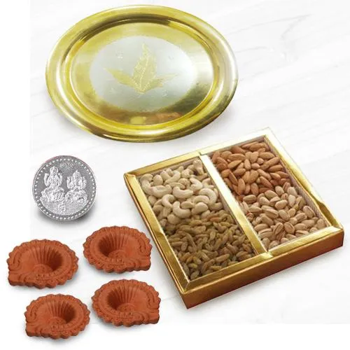 Engage in the true spirit of celebration by sending this Crunchy Dry Fruits Mix with Gold plated Thali N Diya on Diwali that instantly uplifts the mood. This Deepavali Gift Set contains:
