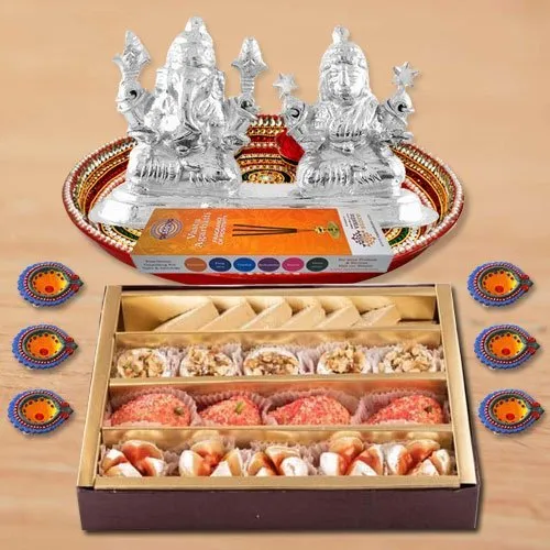 Puja Thali Hamper with 500 gms Assorted sweets from Haldirams and Silver Plated Ganesh Lakshmi with 6 free Diya.