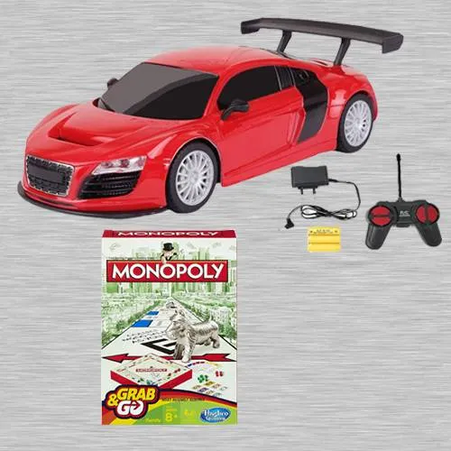 Tighten the bonds of your relationship by ordering online this Exclusive Racing Car with Remote Control N Monopoly Grab N Go Game for your child and give them a reason to love you more. The details of the gift are:
