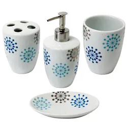 Pick these Exquisite Receptacles of Sundries and deck up the milieu of your bathroom. This ensemble, devised out of Bone China and highlighted with Dark Blue, Light Blue and Brown motifs, embraces one Soap Dish, one Liquid Hand-Soap Container, one Toothbrush Holder with four Cubicles and one Sundry Holder.