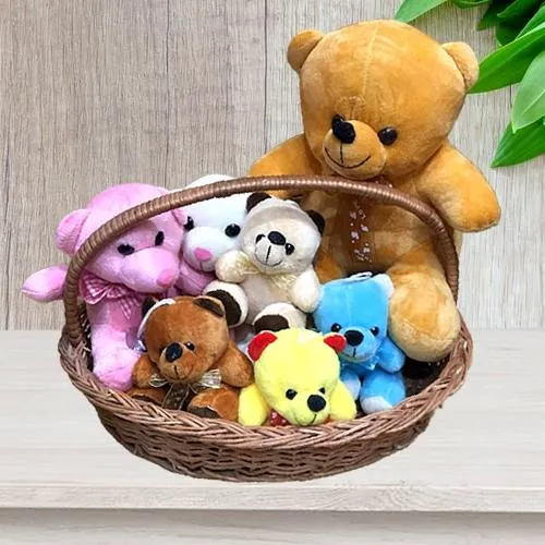 Present this Exquisite Valentine Gift of Basket Full of Teddies on Valentines Day to perfectly convey your heart filled message to your loved one. This Gift Basket include 7 Teddies (30 cm Teddy-1pc, 24 cm Teddy-1pc n 15 cm Teddies-5pc).