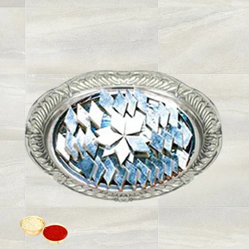 250 Gms. Kaju Katli from Haldiram in a Steel Thali with Roli Tilak and Chawal. Note: Gross Weight applies for Sweets.Thali Size: 8 to 9 inch.(Weights are Gross Weight)
