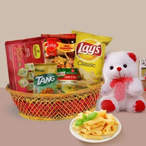 Send this delightful gift of Juicy Hamper Basket full of Happiness with unlimited love and best wishes. 6 inch Teddy, Haldiram Chanachur, Haldiram Soan Papdi, Lays Chips Packet, Tang Juice Packet, Maggi Pasta Pack, Knorr Soup are the main ingredients of the Basket Hamper.