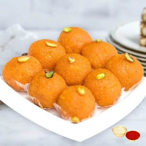 Motichur Ladoo from Haldiram 1/2 Kg (Gross Weight) with Roli Tilak and Chawal.